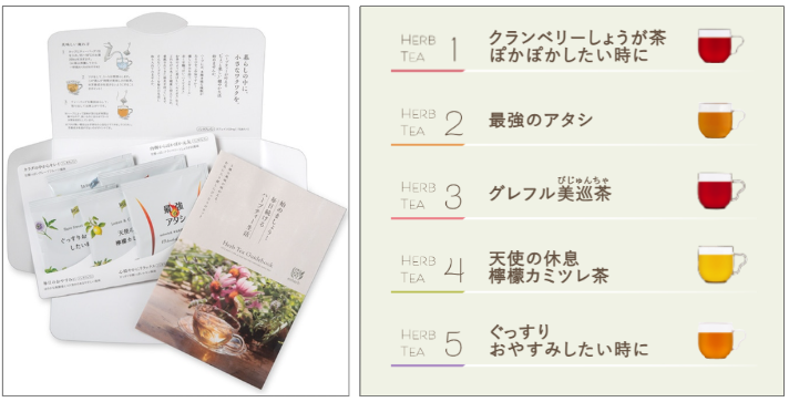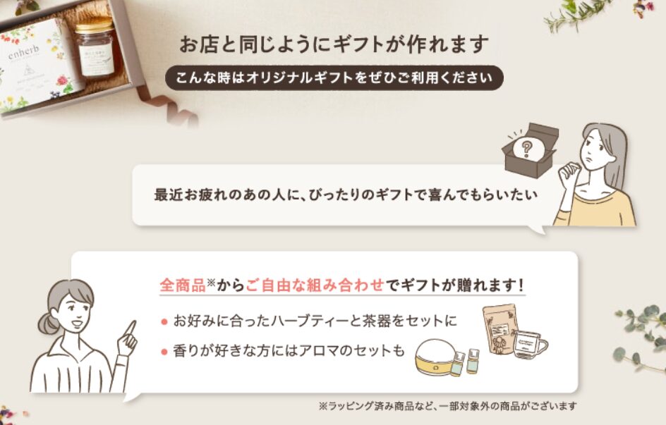 特に、「オリジナルギフト」サービスでは、予算や贈る目的(リラックス、美容など)に応じて、ハーブティーやアロマなどの商品を自由に組み合わせて特別なギフトセットを作成できます。