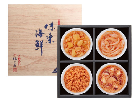 いか・数の子・鮭・たこの4種類の海鮮を福さ屋自慢の辛子めんたいと和えた贅沢な詰め合わせ。