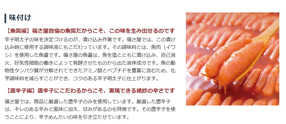 福さ屋の明太子は、輸入される新鮮なスケトウダラの卵の品質が良いこと、そして熟練の職人が「匠のたれ」でじっくり漬け込むという、手間と時間のかかる伝統的な製法を守っているためです。