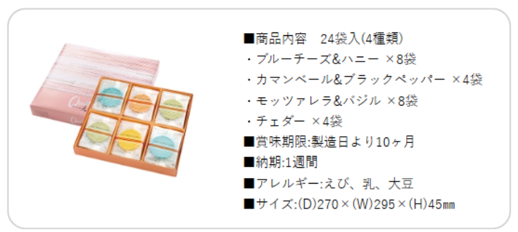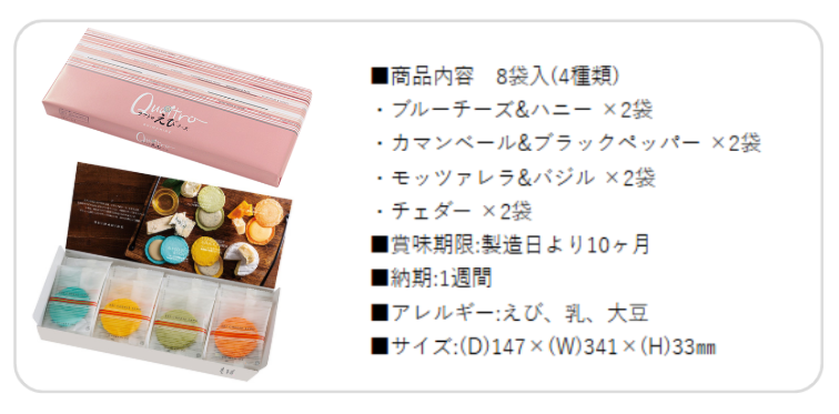 香ばしい海老せんに、チェダー・カマンベール&ブラックペッパー・モッツァレラ&バジル・ゴルゴンゾーラ&ハニーの4つの味わいがとけ込んでおり、ギフトにぴったりの華やかさと上品さを兼ね備えています。