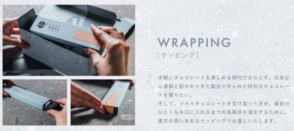 ソイルチョコレートは、味だけでなく香りの良さにも定評があり、パッケージはシンプルながらも洗練されたスタイリッシュなデザインが特徴です。