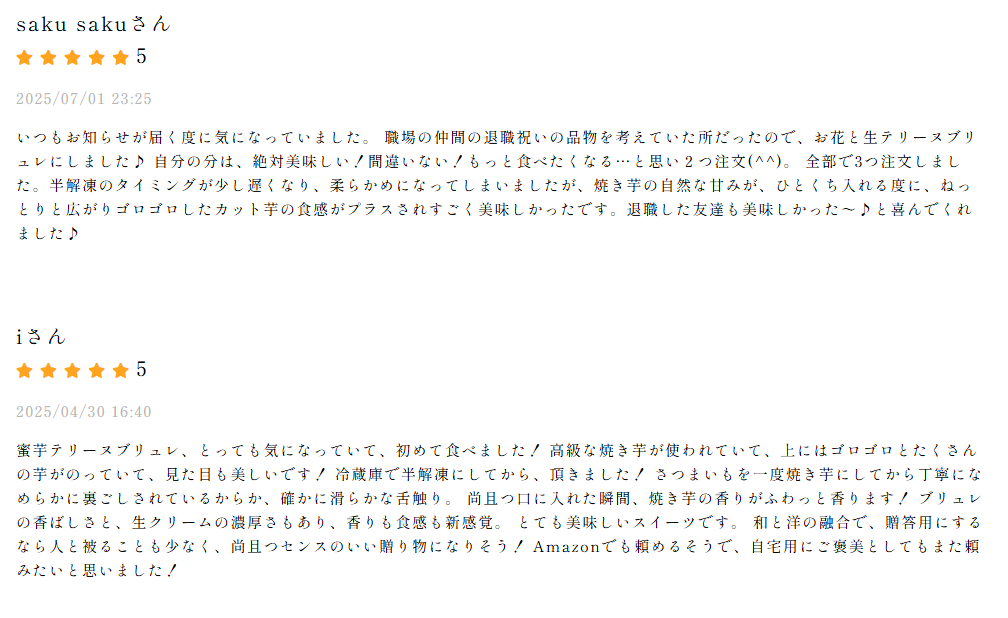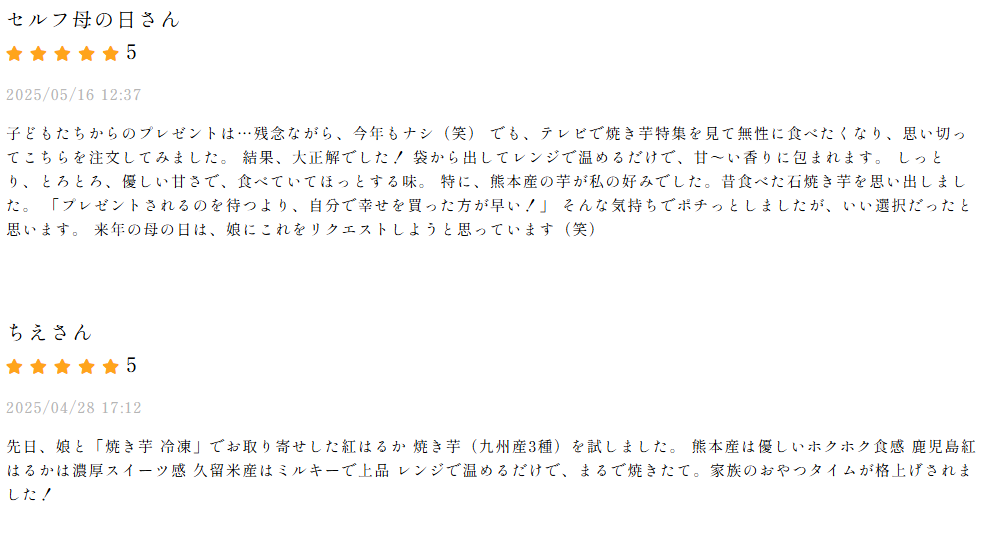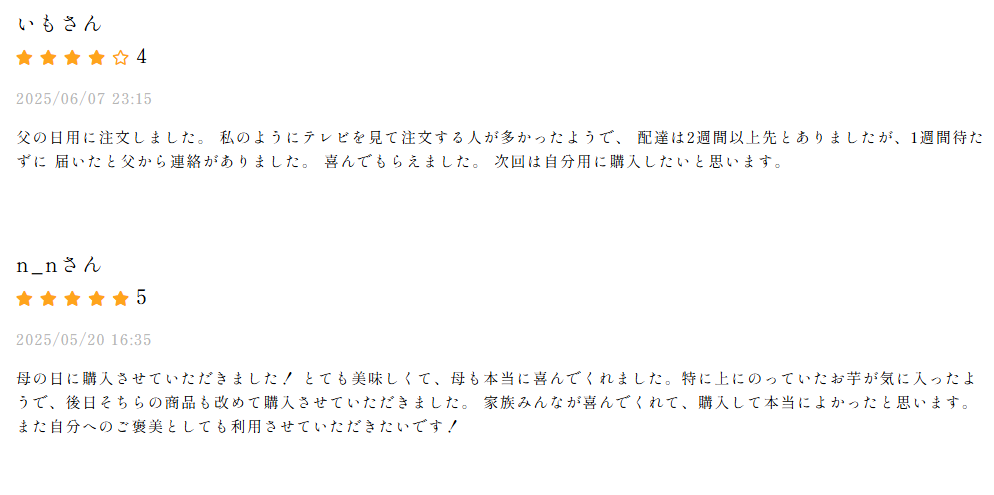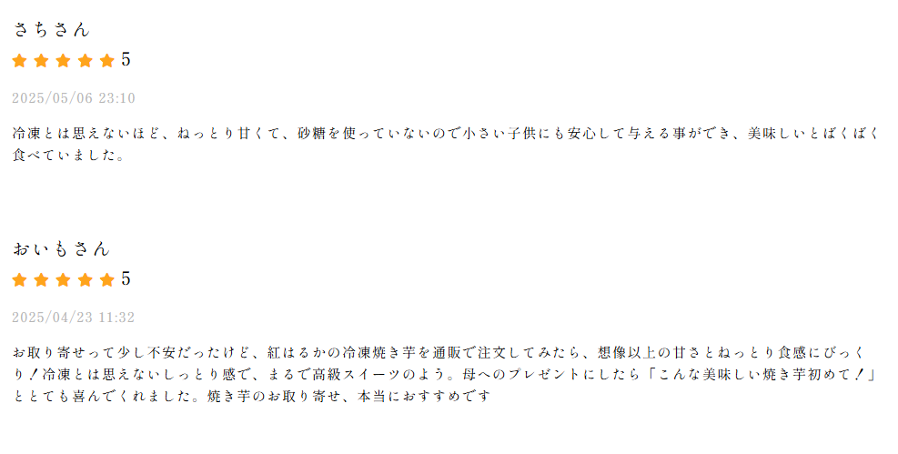 甘さに強いこだわりがある方は、公式サイトの商品詳細ページで芋の品種と特徴を確認するとともに、購入前に利用者の口コミをチェックしましょう。