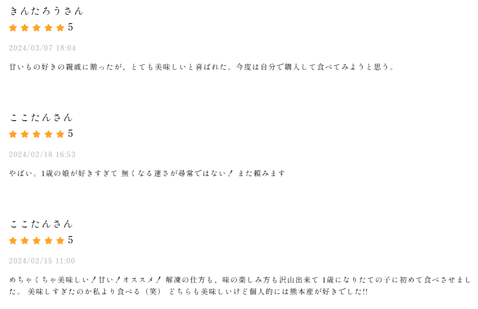 ただし、味については「とても甘くて美味しい」と評価されており、品質自体には満足されている様子がうかがえます。