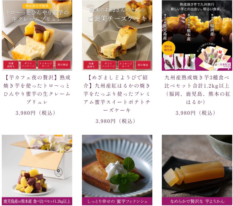 公式ショップでは、焼き芋・チーズケーキ・ギフトセットなどの定番に加え、公式限定の詰め合わせや季節の特別セットが登場するのも魅力。